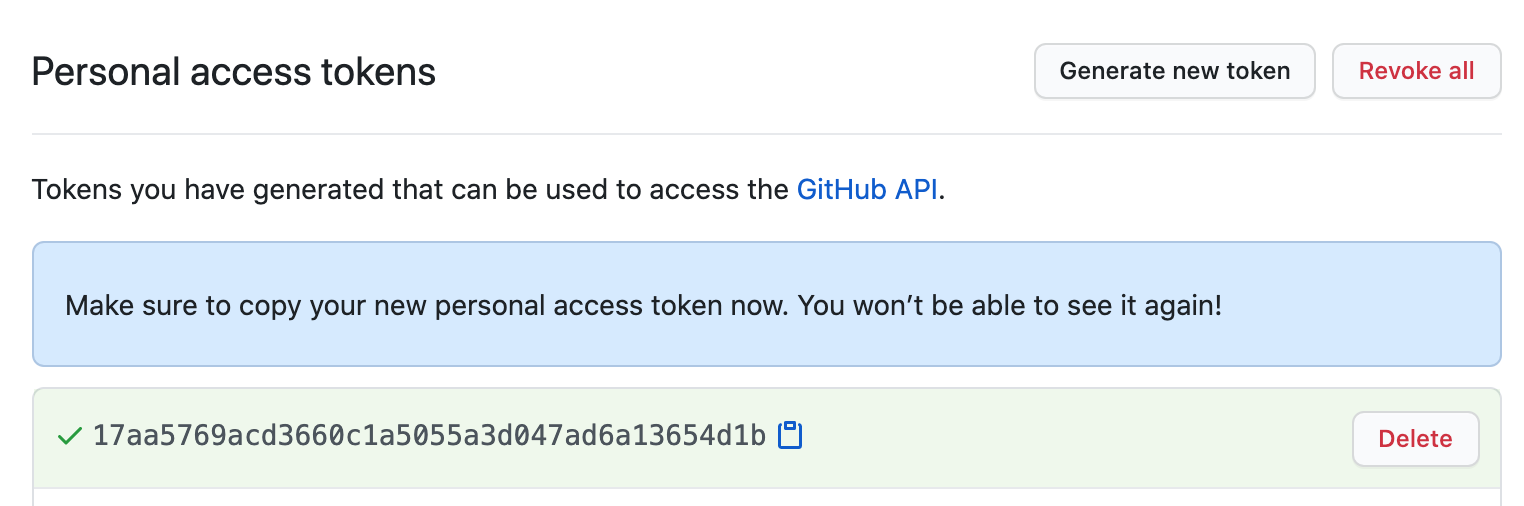 그럼 해쉬화된 PAT를 얻을 수 있는데요, 이 토큰은 절대로 다시 확인할 수 없으니 메모장 등에 복사해두어야 합니다.