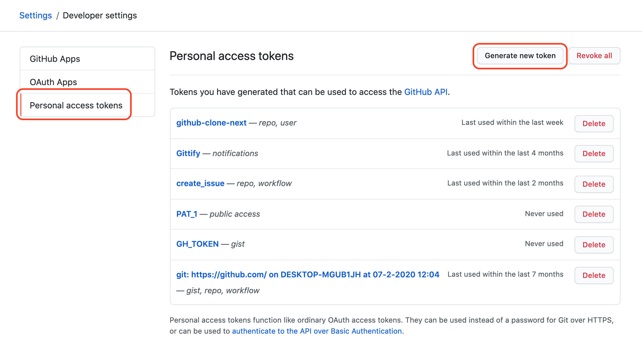 개발자 설정에 진입하면 개발에 필요한 도구들을 관리할 수 있는데요, 이 중 Personnal access tokens 메뉴에서 새로운 토큰을 생성합니다.