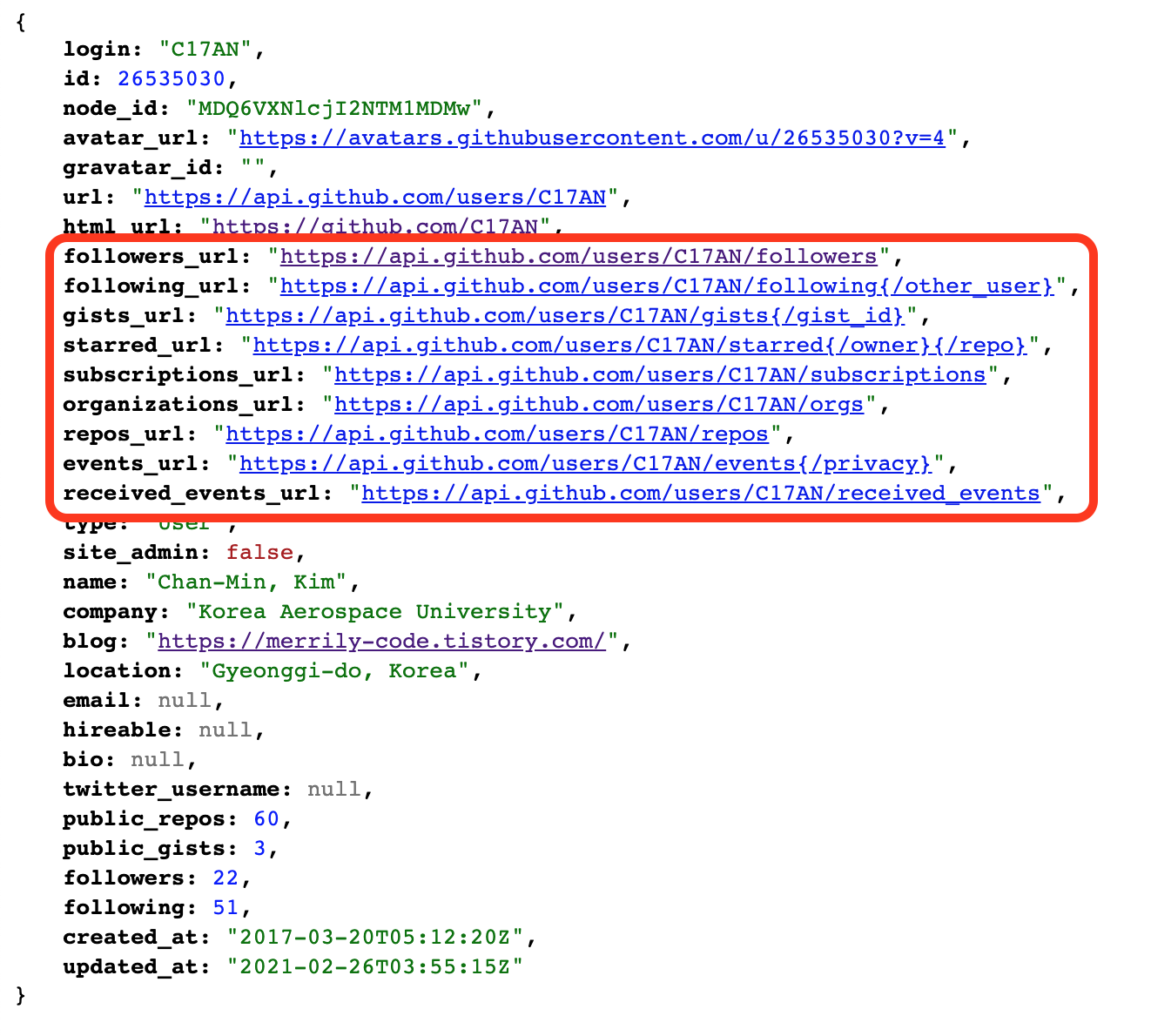 뿐만 아니라 유저 정보에는 팔로워나 저장소 목록 등을 불러올 수도 있는 엔드포인트도 포함되어 있는데요, 이처럼 유저의 거의 모든 정보를 손쉽게 얻을 수 있다는 점이 깃허브 api의 매력입니다.