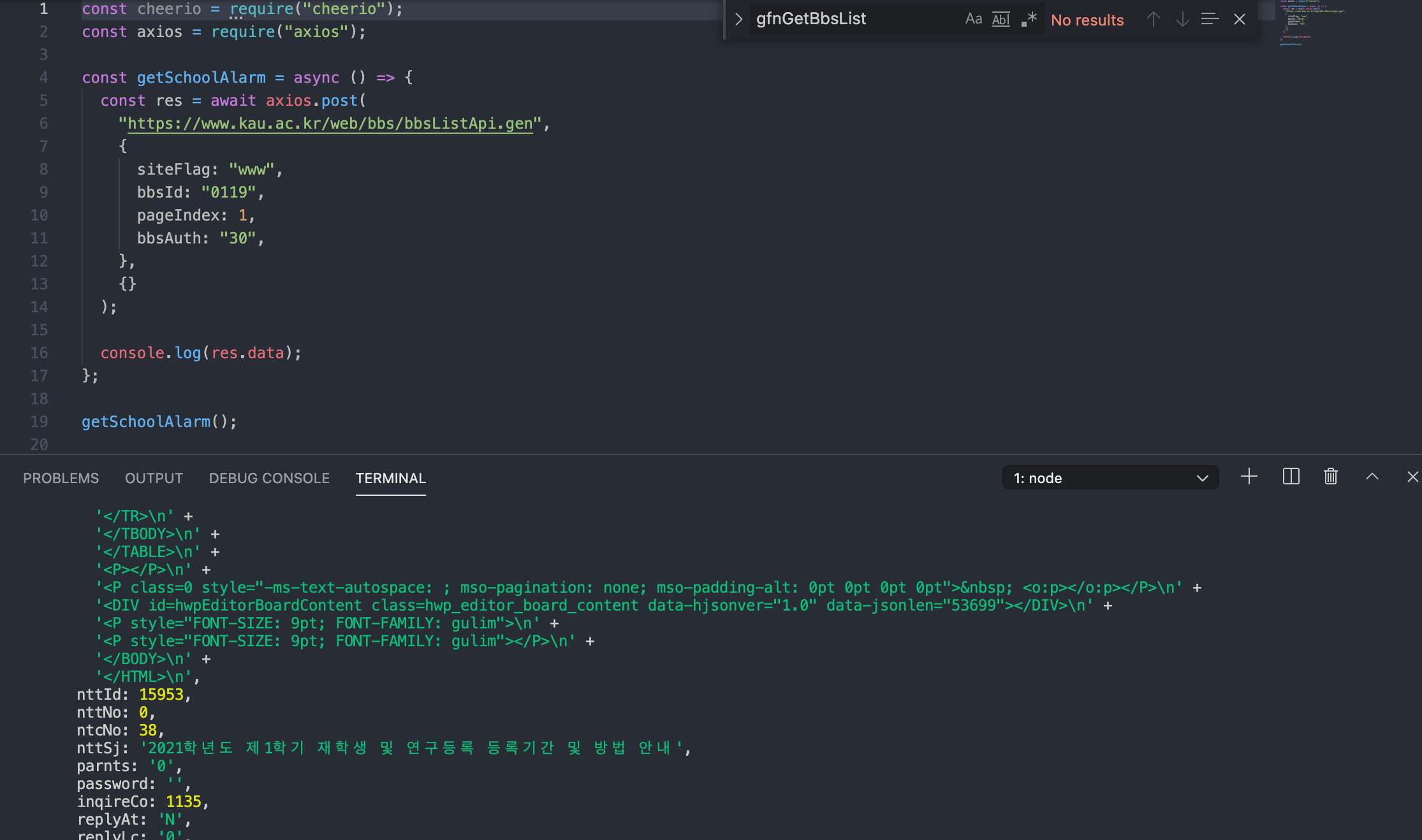 - 항공대 공지사항 크롤링을 위해서는 https://www.kau.ac.kr/web/bbs/bbsListApi.gen 에 다음 body를 포함해 POST 요청을 보내면 됩니다.