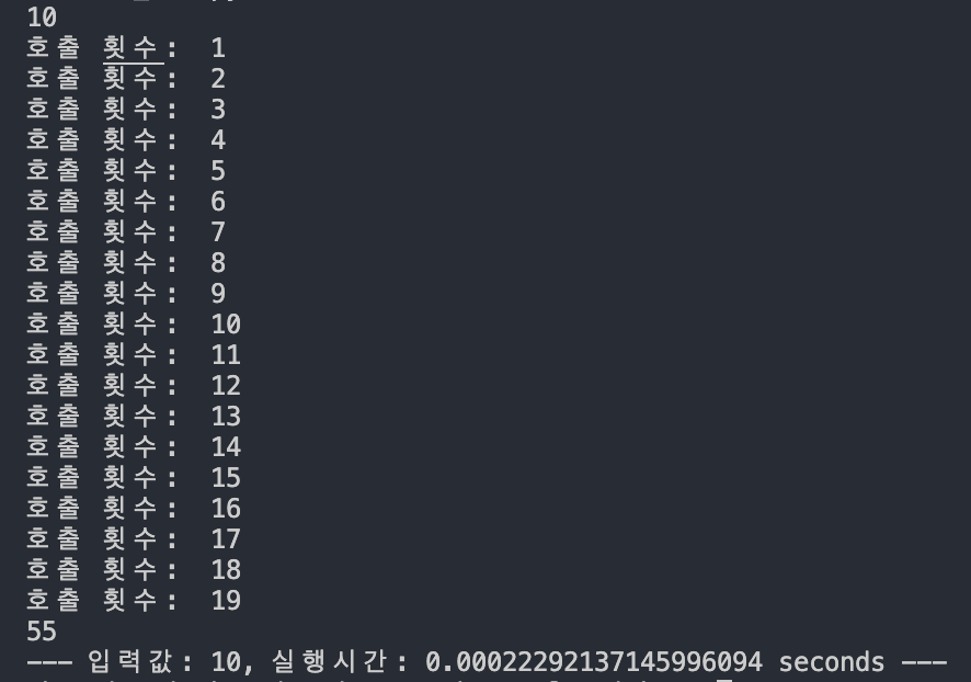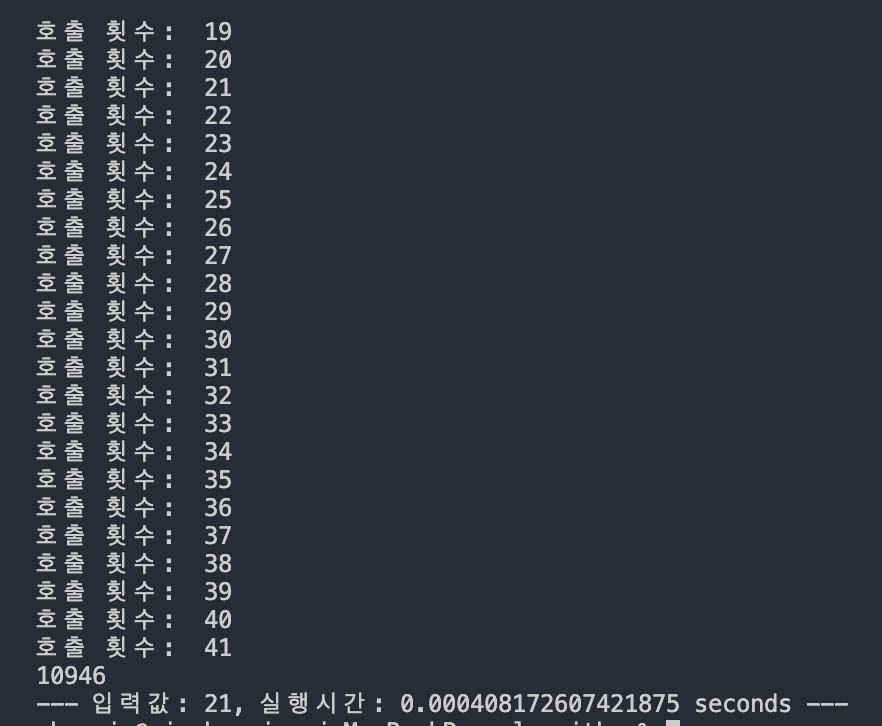 어떤가요? 21번째 피보나치 수를 구하기 위해 함수를 약 3만 번 호출하다가 메모이제이션을 적용하니 41번만에 계산을 마칠 수 있었습니다.