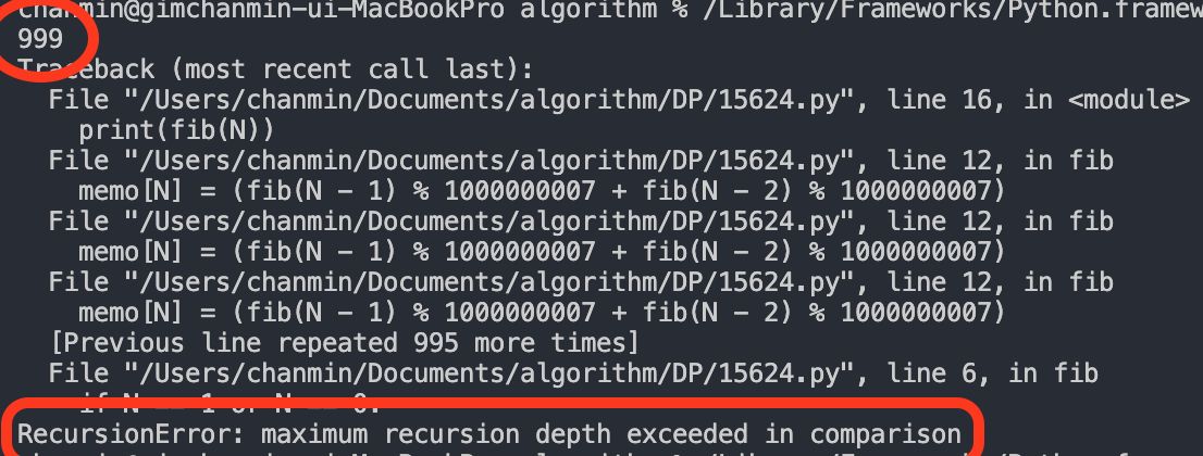 C++이나 자바 등의 언어에서는 어떤지 모르겠지만, 파이썬은 기본적으로 1000번까지의 *재귀 호출만을 허용합니다.
