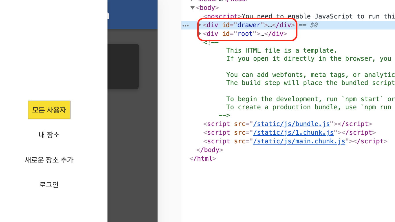 위의 드로어를 root의 자식이 아닌 형제 요소로 렌더링하기 위해 id = "drawer" 라는 형제 요소를 생성한 모습이다.