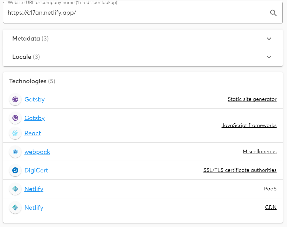 Wappalyzer는 한달의 50개의 사이트를 무료로 확인할 수 있으며 어떤 기술이 어떤 역할로 사용되었는지 구체적으로 알려주는데요, 예를 들어 개츠비와 리액트로 제작한 제 이전 블로그를 확인해 보면 이런 분석 결과를 얻을 수 있습니다.