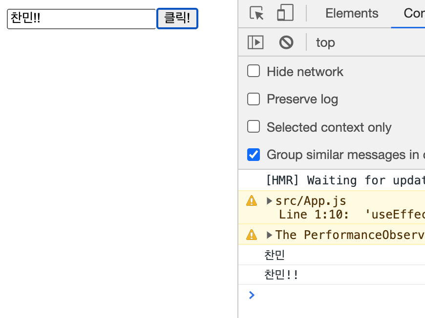 위 코드의 입력 폼에서 "찬민" 을 입력하면 당연히 "찬민" 이 화면에 보이게 되고, 입력 시마다 onChange 의 콜백을 호출함에 따라 컴포넌트가 갖는 inputValue 상태의 값도 "찬민" 이 됩니다.