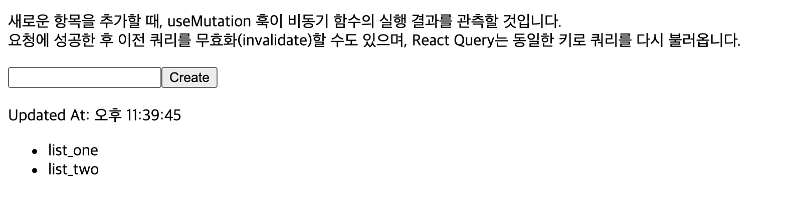 이 간단한 예제는 axios를 사용해 API로부터 문자열이 담긴 배열을 받아오고, 주어진 폼을 통해 새로운 문자열을 배열에 추가할 수도 있습니다. 또 열려있는 React Query DevTools을 활용해 캐시된 데이터를 실시간으로 확인할 수도 있습니다.