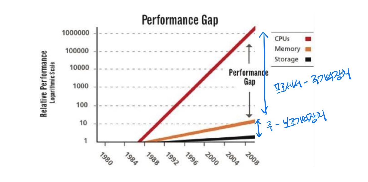 - 디스크 입출력 병목현상 해소에 사용 => 보조기억장치는 엄청 느림.