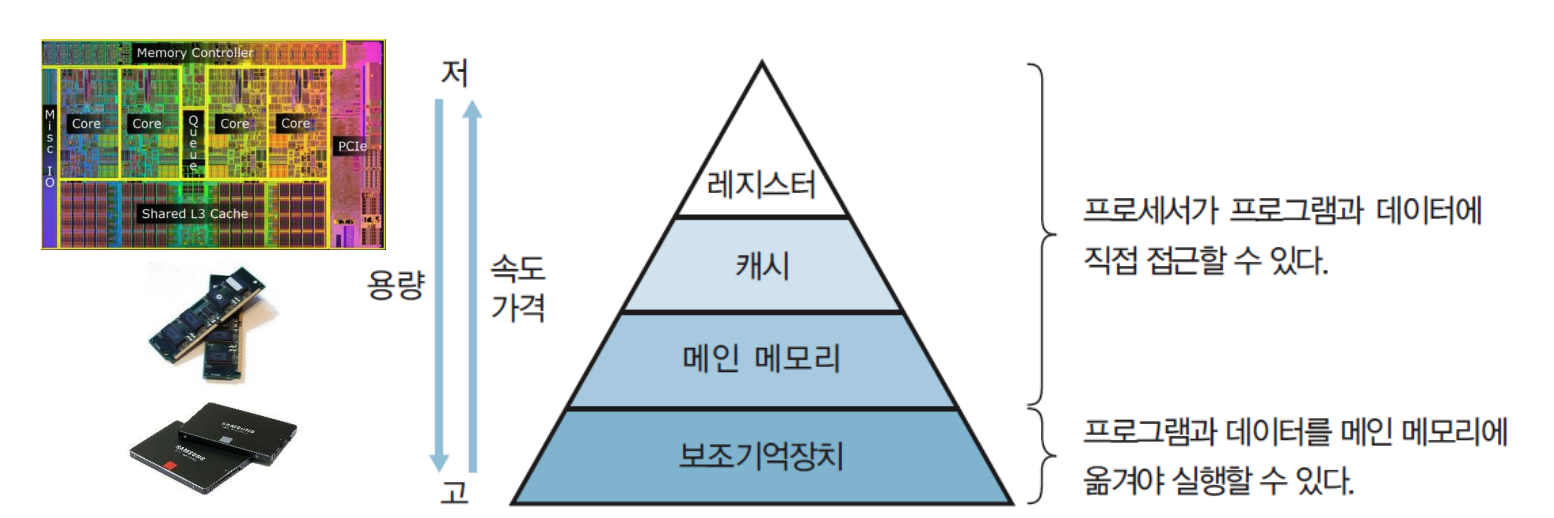 - 주 기억장치 - RAM : 프로세서가 실행할 프로그램과 데이터 저장