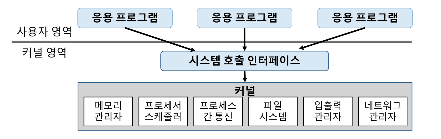 - 한 커널에서 모든 시스템을 제어하고 있는 운영체제 구조