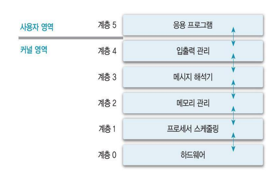 - 현대 운영체제는 대부분 계층 구조를 채택하였음.