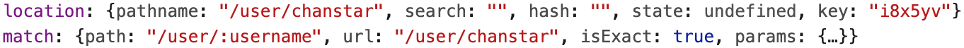 경로 속성이 전달되는 것이 확인됐다면, 현재 페이지의 URL에 관한 정보를 담고 있는 location과 match 값에 주목해 봅시다.
