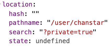 예를 들어 http://localhost:3000/user/chanstar?private=true 라는 경로로 접근했을 때 쿼리스트링에 해당하는 "private=true" 만을 필요로 한다면, 아래 그림처럼 location.search 값을 통해 쿼리스트링을 추출할 수 있습니다.