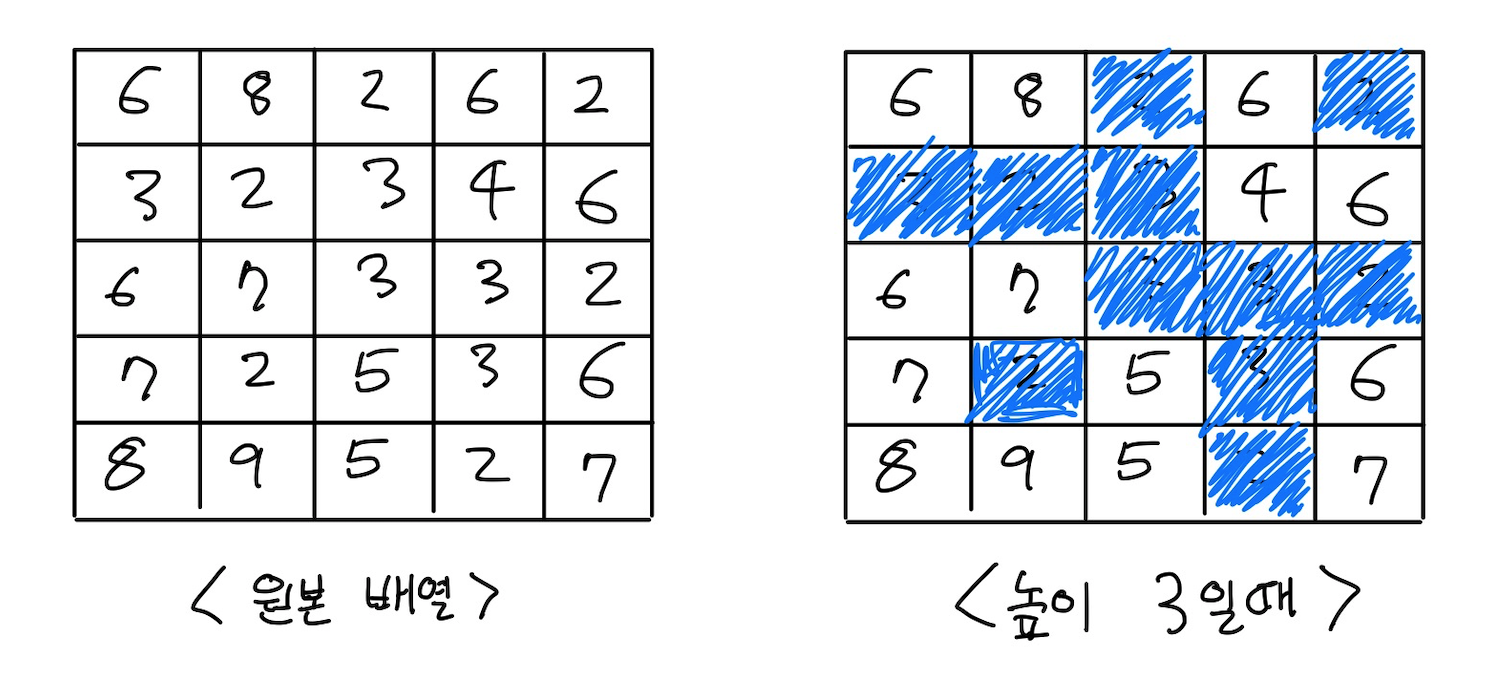 테스트케이스로 주어진 배열과 함께 빗물의 높이가 3인 경우를 예로 들겠습니다.