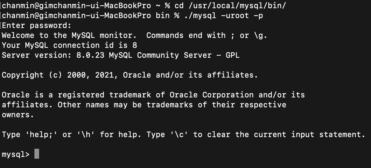 명령어를 입력하면 이렇게 MySQL 모니터가 터미널처럼 나타나는데요, 이제 MySQL을 사용할 준비가 모두 끝났습니다.