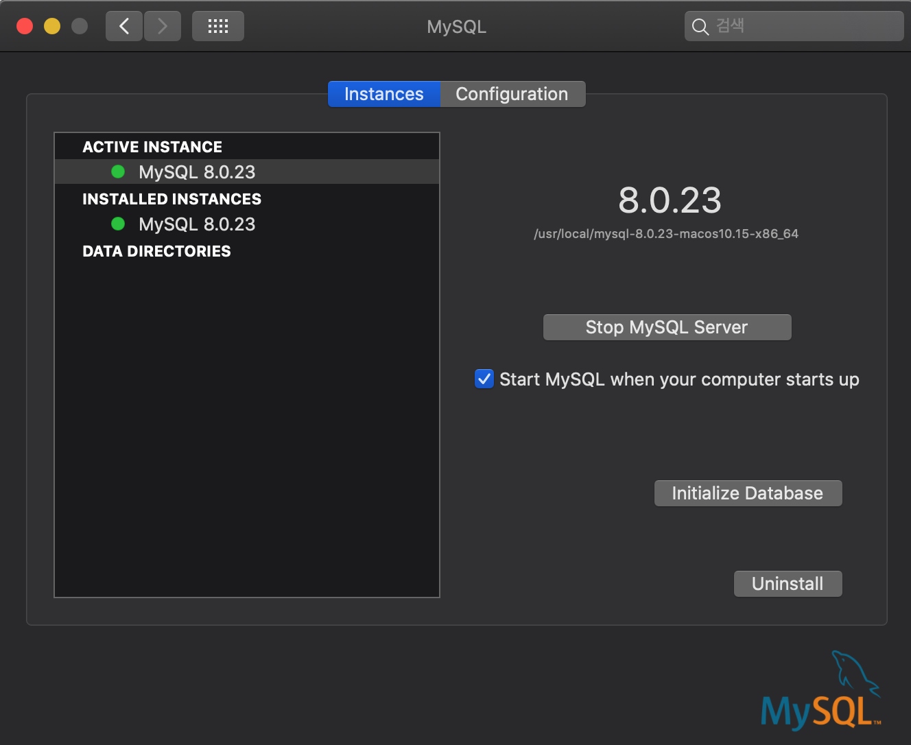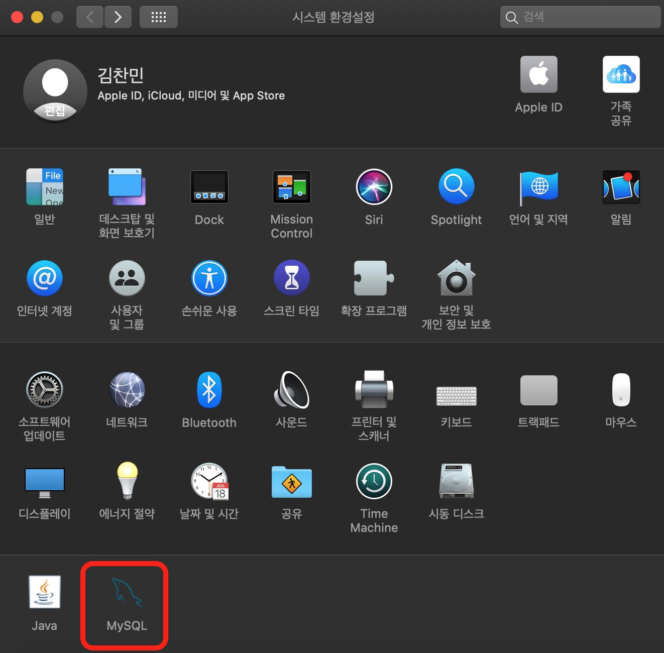 설치가 끝났다면 시스템 환경설정에서 MySQL 설정이 추가된 것을 확인할 수 있습니다.